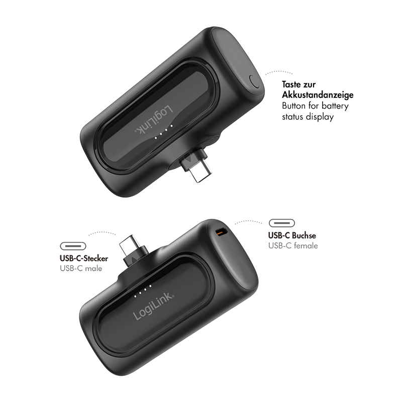 Compacte powerbank 5.000 mAh, 2x USB-C, snellaadfunctie, zwart De 5000 mAh powerbank van LogiLink met geïntegreerde, opvouwbare USB-C-stekker biedt een breed scala aan voordelen voor mobiele gebruikers. Het compacte formaat en het lage gewicht maken hem de ideale metgezel voor op reis. De capaciteit is voldoende voor een volle smartphone, terwijl de geïntegreerde stekker kabelchaos voorkomt. Met uitgebreide veiligheidsfuncties: bescherming tegen overladen, te diep ontladen, overbelasting, overstroom, te hoge temperatuur en kortsluiting zorgen voor een veilig en betrouwbaar gebruik. Deze functies verlengen niet alleen de levensduur van de powerbank, maar beschermen ook de aangesloten apparaten. De combinatie van gebruiksvriendelijkheid, prestaties en veiligheid maakt deze powerbank tot een onmisbaar accessoire voor de moderne, mobiele levensstijl.