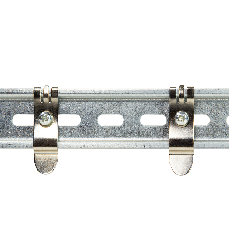 DIN-rail montagebeugels, roestvrij staal, 2 stuks Deze stevige beugels zijn perfect voor het bevestigen van apparaten aan standaard DIN-rails. Dit artikel bestaat uit 2 roestvrijstalen beugels met schroef. Ze zijn ontworpen om perfect te passen op standaard 35 mm rails met een diepte van 7,5 mm. De beugels zijn eenvoudig te bevestigen en te verwijderen. De clip "grijpt" de rail vast aan de boven- en onderlip van de DIN-rail.