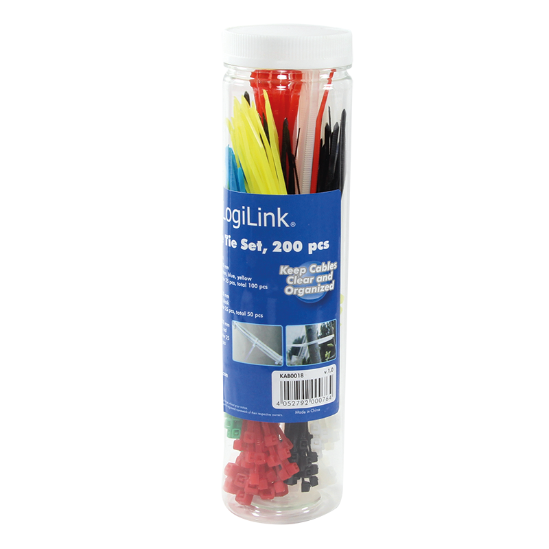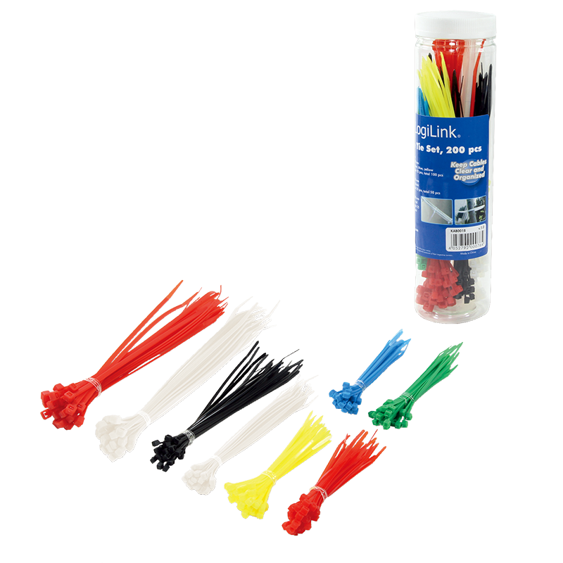 Kabelbinderset, PA66, 200 stuks, gemengde kleur, verschillende lengtes