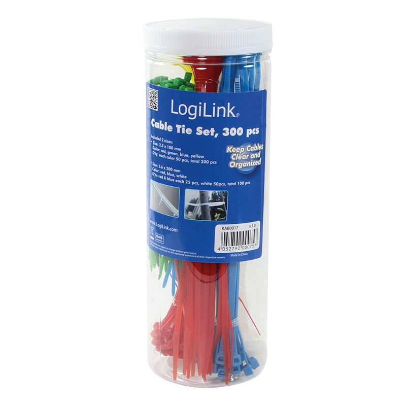 Kabelbinderset, PA66, 300 stuks, gemengde kleur, verschillende lengtes