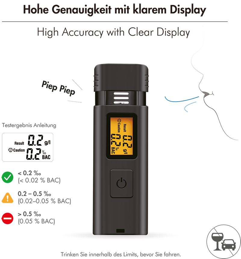 Alcoholtester, LCD-scherm, zwart Houd uw alcoholpromillage in de gaten – snel, eenvoudig en hygiënisch! Deze compacte blaastester van LogiLink toont binnen enkele seconden uw alcoholpromillage. Zo bespaart de tester u boetes na een feestje of evenement. De bediening is eenvoudig: plaats 2 AAA-batterijen (niet meegeleverd) en blaas 3-5 seconden in de alcoholtester om het resultaat te krijgen. Alle testresultaten, inclusief het batterijniveau, worden weergegeven op het lcd-scherm. Als uw testresultaat hoger is dan 0,5 ‰ BAC, klinkt er een alarm. Na 15 seconden inactiviteit schakelt de tester automatisch uit. Dankzij het compacte formaat met een koordoog kunt u hem gemakkelijk aan uw sleutels bevestigen of in een rugzak, handtas of tas meenemen. Neem hem mee naar bruiloften, feesten, banketten of andere sociale evenementen om ervoor te zorgen dat u veilig rijdt na alcoholgebruik.