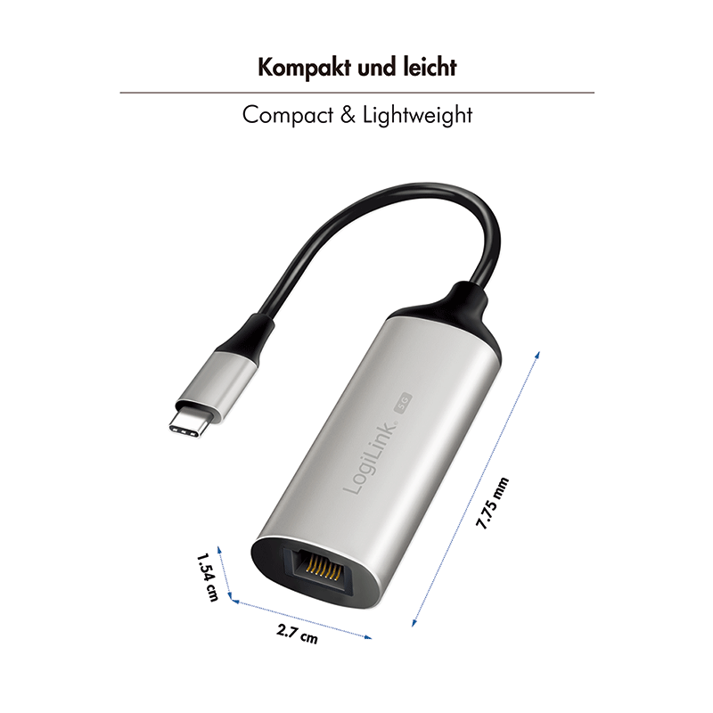 USB-C/M 3.2 Gen 1 naar RJ45/F 5G Gigabit Ethernet-adapter, Full Duplex Flow Control, aluminium